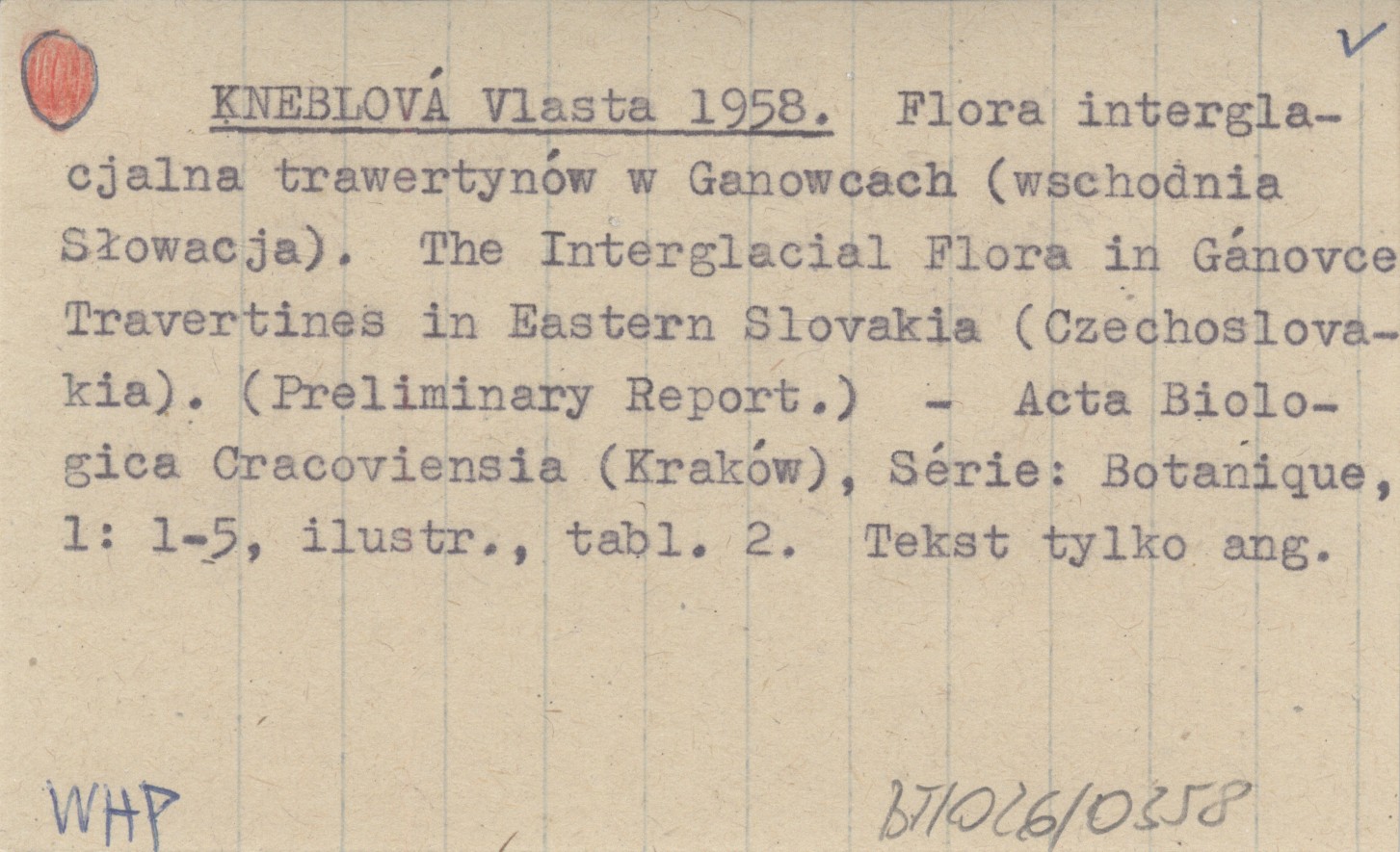 KNEBLOVÁ Vlasta 1958 Flora interglacjalna trawertynów w Ganowcach (wschodnia Słowacja). The Interglacial Flora in Gánovce Travertines in Eastern Slovakia (Czechoslovakia). (Preliminary Report.).