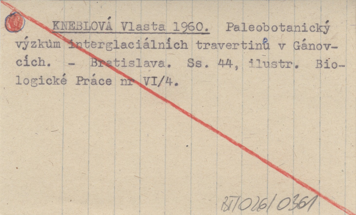 KNEBLOVÁ Vlasta 1960 Paleobotanický výzkum interglaciálních travertinů v Gánovcích.