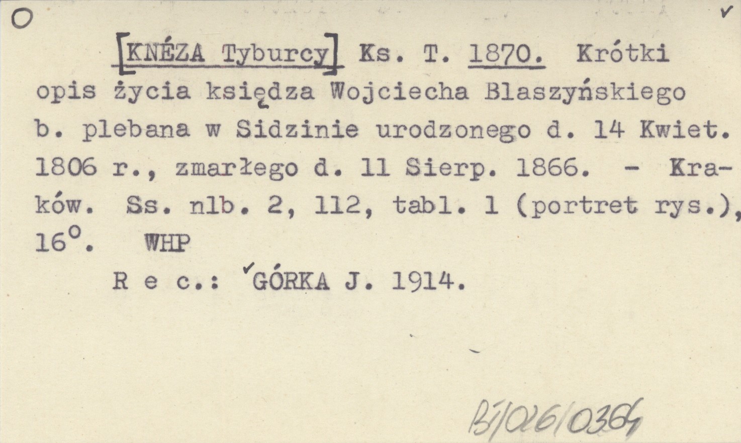 Ks. T. [KNÉZA Tyburcy] 1870 Krótki opis życia księdza Wojciecha Blaszyńskiego b. plebana w Sidzinie urodzonego d. 14 Kwiet. 1806 r., zmarłego d. 11 Sierp. 1866.