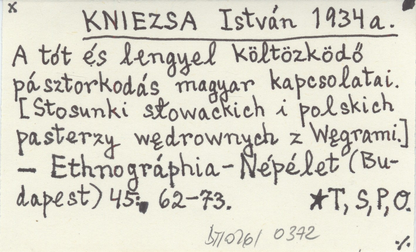 KNIEZSA István 1934 a A tót és lengyel költözködő pásztorkodás magyar kapcsolatai. [Stosunki słowackich i polskich pasterzy wędrownych z Węgrami.].