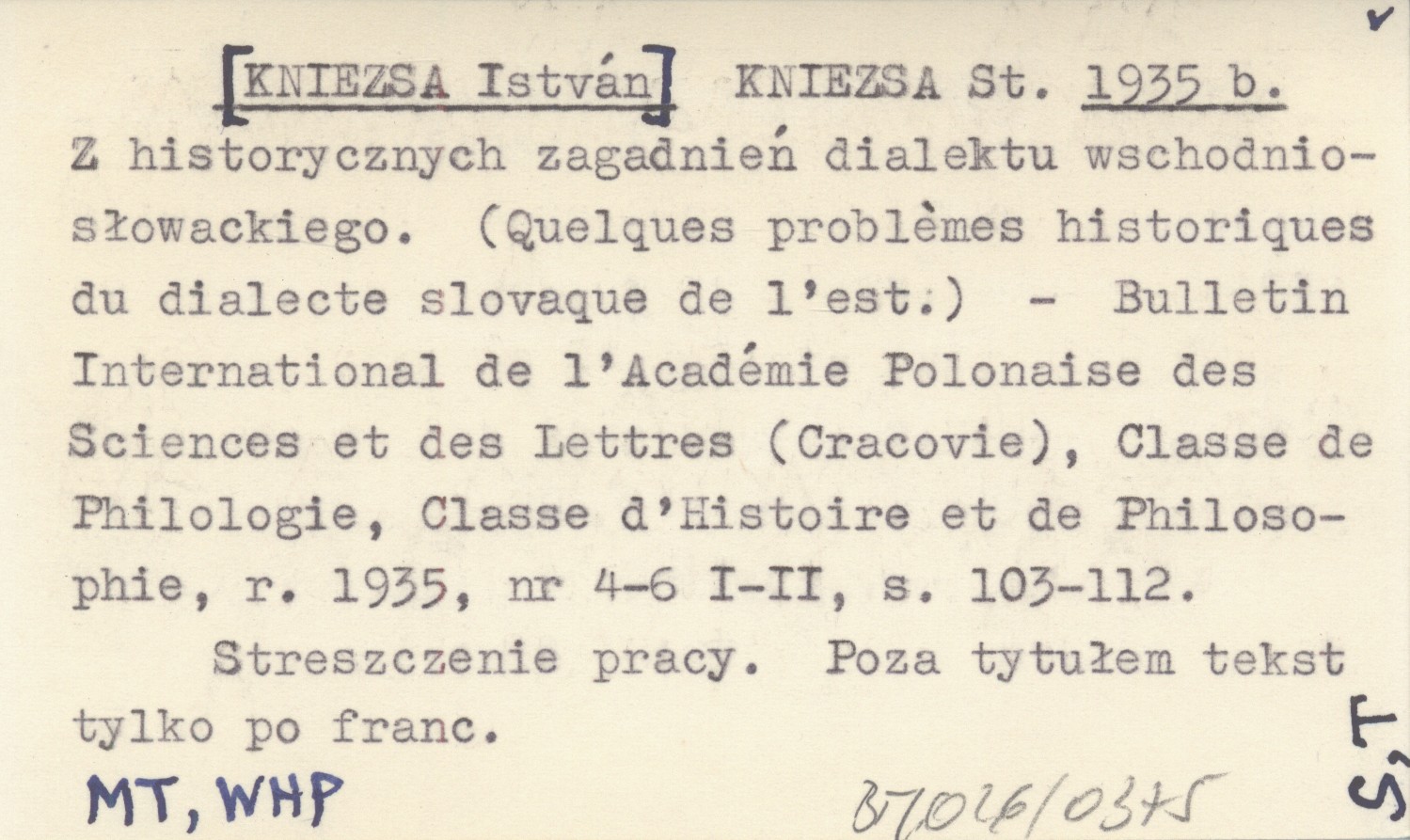 KNIEZSA St. [KNIEZSA István] 1935 b Z historycznych zagadnień dialektu wschodniosłowackiego. (Quelques problémes historiques du dialecte slovaque de l'est.).
