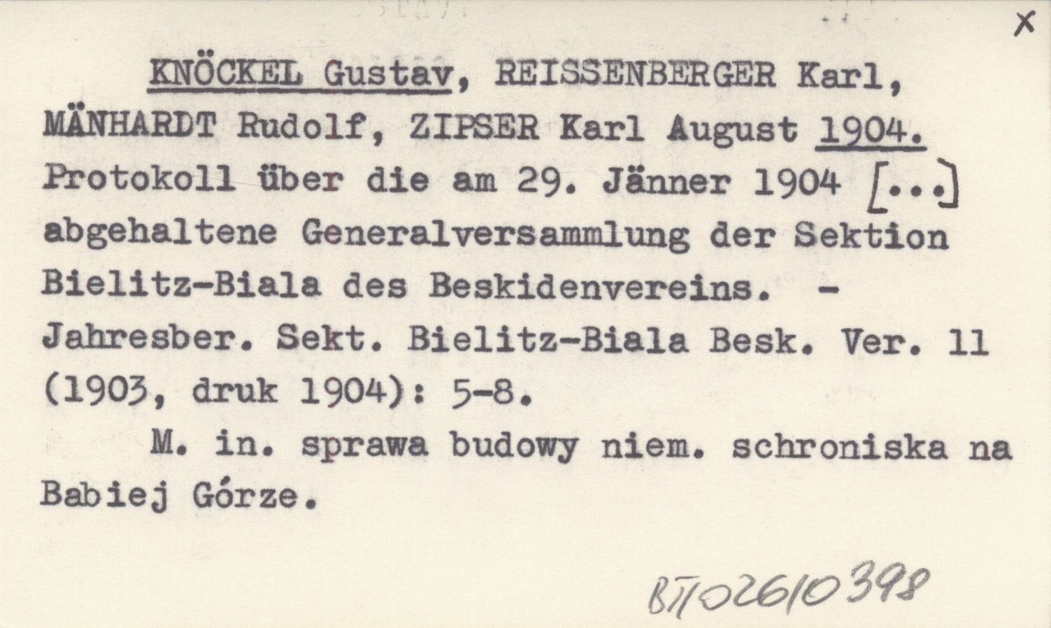 KNÖCKEL Gustav REISSENBERGER, Karl. ; MÄNHARDT, Rudolf. ; ZIPSER, Karl August. ; 1904 Protokoll über die am 29. Jänner 1904 [...] abgehaltene Generalversammlung der Sektion Bielitz-Biala des Beskidenvereins.