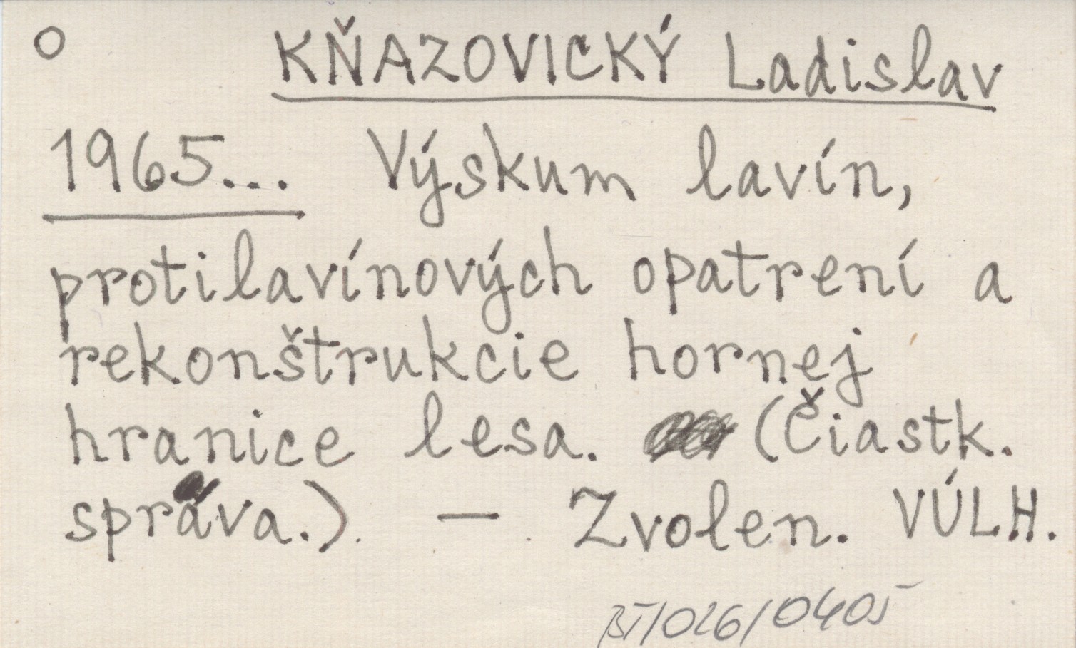 KŇAZOVICKÝ Ladislav 1965... Výskum lavín, protilavínových opatrení a rekonštrukcie hornej hranice lesa. (Čiastk. správa.).