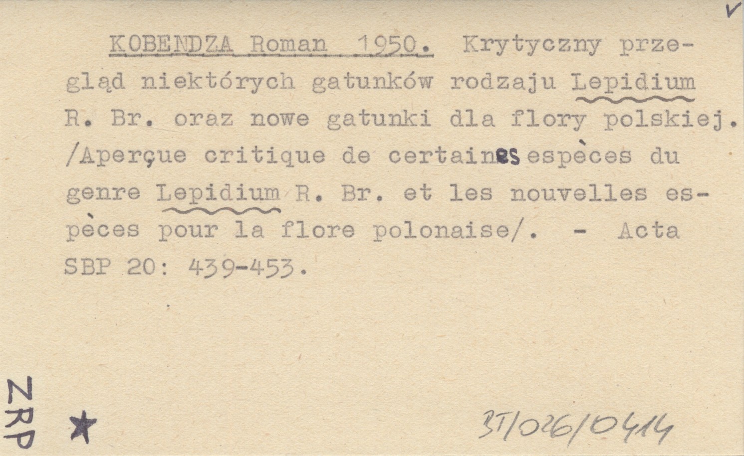 KOBENDZA Roman 1950 Krytyczny przegląd niektórych gatunków rodzaju Lepidium R. Br. oraz nowe gatunki dla flory polskiej. (Aperçue critique de certaines espéces du genre Lepidium R. Br. et les nouvelles espéces pour la flore polonaise).