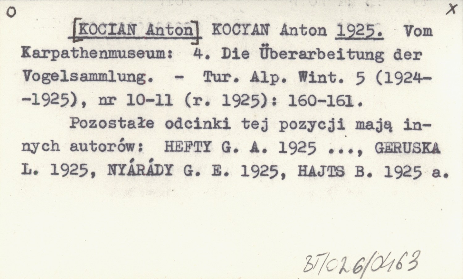 KOCYAN Anton [KOCIAN Anton] 1925 Vom Karpathenmuseum: 4. Die Überarbeitung der Vogelsammlung.