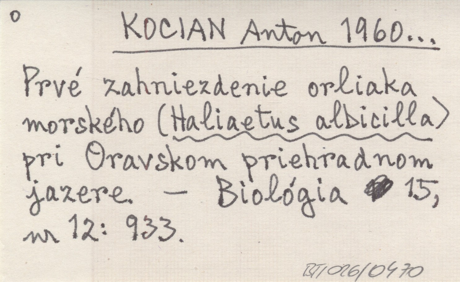KOCIAN Anton 1960... Prvé zahniezdenie orliaka morského (Haliaetus albicilla) pri Oravskom priehradnom jazere.