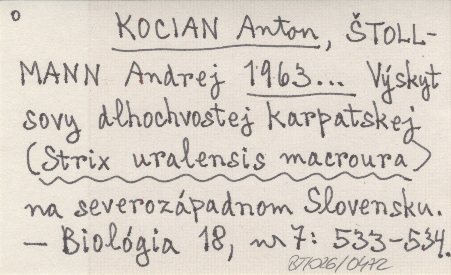 KOCIAN Anton ŠTOLLMANN, Andrej. ; 1963... Výskyt sovy dlhochvostej karpatskej (Strix uralensis macroura) na severozápadnom Slovensku.