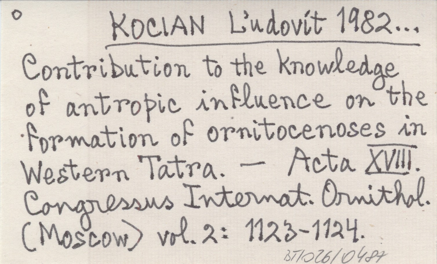 KOCIAN Ľudovít 1982... Contribution to the knowledge of antropic influence on the formation of ornitocenoses in Western Tatra.