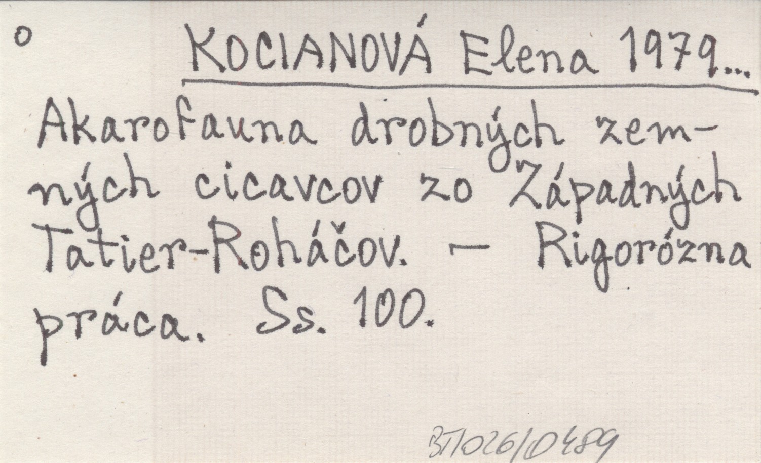 KOCIANOVÁ Elena 1979... Akarofauna drobnęch zemnęch cicavcov zo Západnęch Tatier-Roháèov.