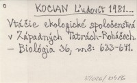 KOCIAN Ľudovít 1981... Vtáčie ekologické spoločenstvá v Západných Tatrách-Roháčoch.