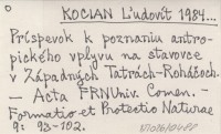 KOCIAN Ľudovít 1984... Príspevok k poznaniu antropického vplyvu na stavovce v Západných Tatrách-Roháčoch.