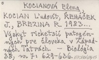KOCIANOVÁ Elena KOCIAN, Ľudovít. ; ŘEHÁČEK, J. ; BREZINA, R. ; 1983... Výskyt ricketsií patogénnych pre človeka v Západných Tatrách.