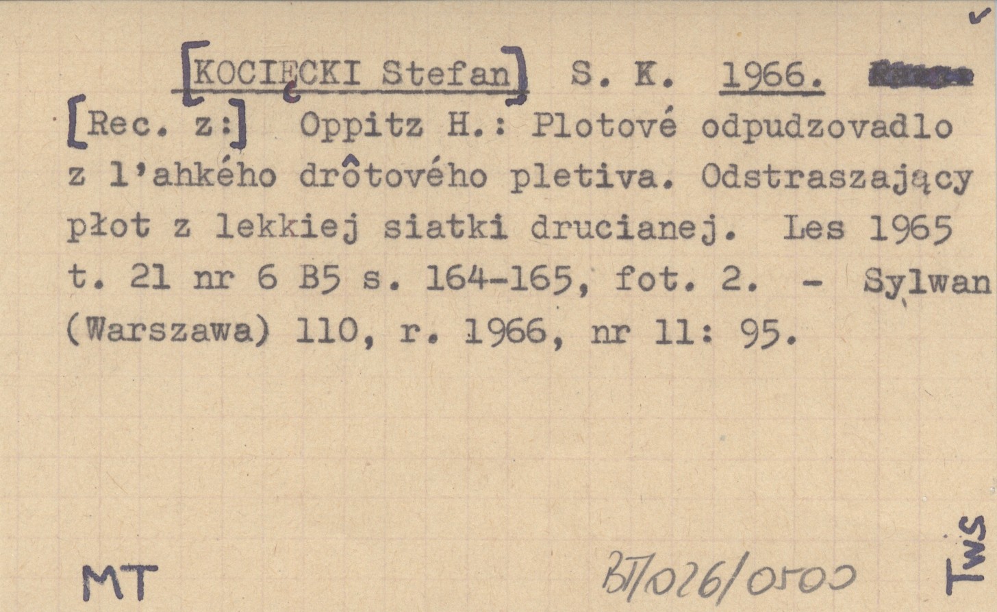 S. K. [KOCIĘCKI Stefan] 1966 Oppitz H.: Plotové odpudzovadlo z ľahkého drôtového pletiva. Odstraszający płot z lekkiej siatki drucianej. Les 1965 t. 21 nr 6 B5 s. 164-165, fot. 2.