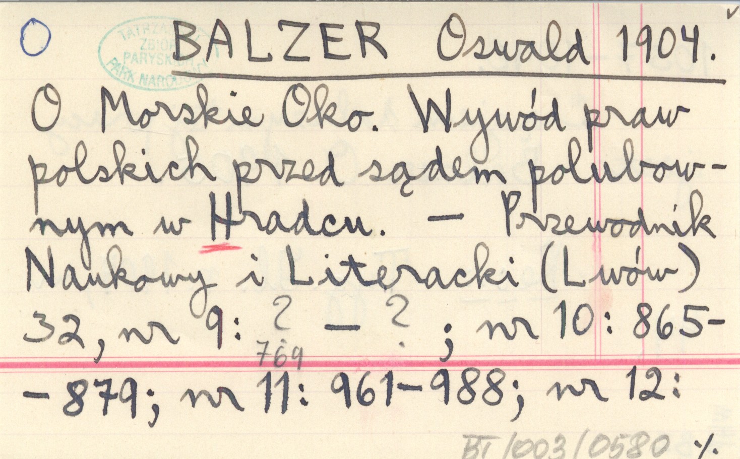 BALZER Oswald 1904 O Morskie Oko. Wywód praw polskich przed sądem polubownym w Hradcu.