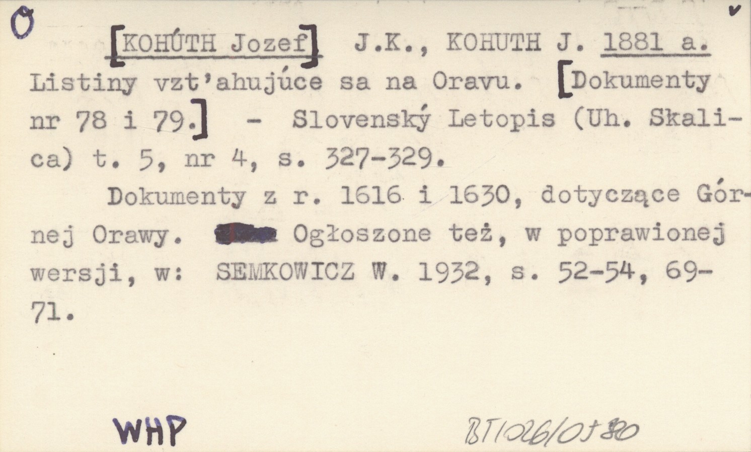 J.K. ; KOHUTH J. ; [KOHÚTH Jozef] 1881 a Listiny vzťahujúce sa na Oravu. [Dokumenty nr 78 i 79.].