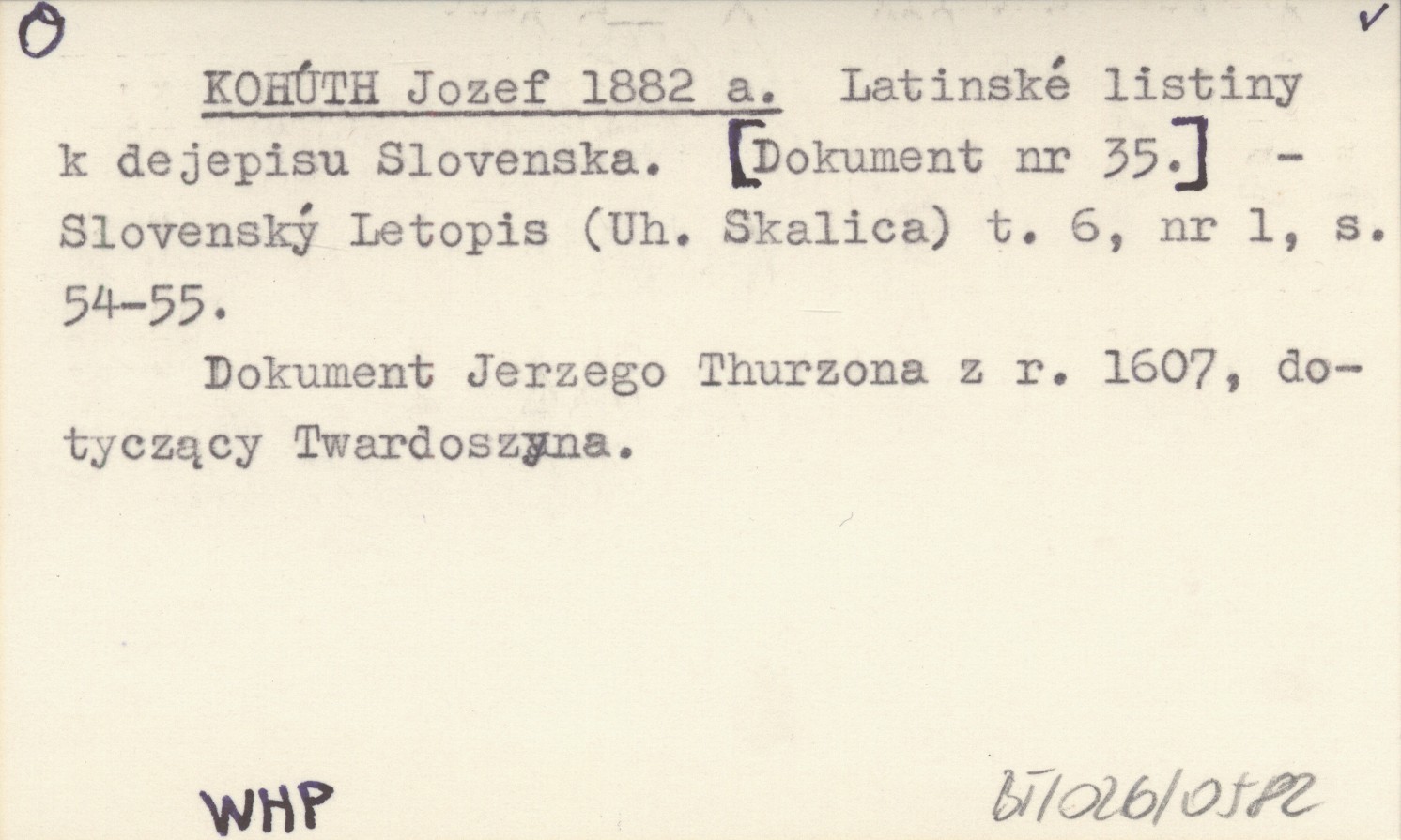 Slovenský Letopis (Uh. Skalica) , T. 6, nr 1: 54-55. Dokument Jerzego Thurzona z r. 1607, dotyczący Twardoszyna.