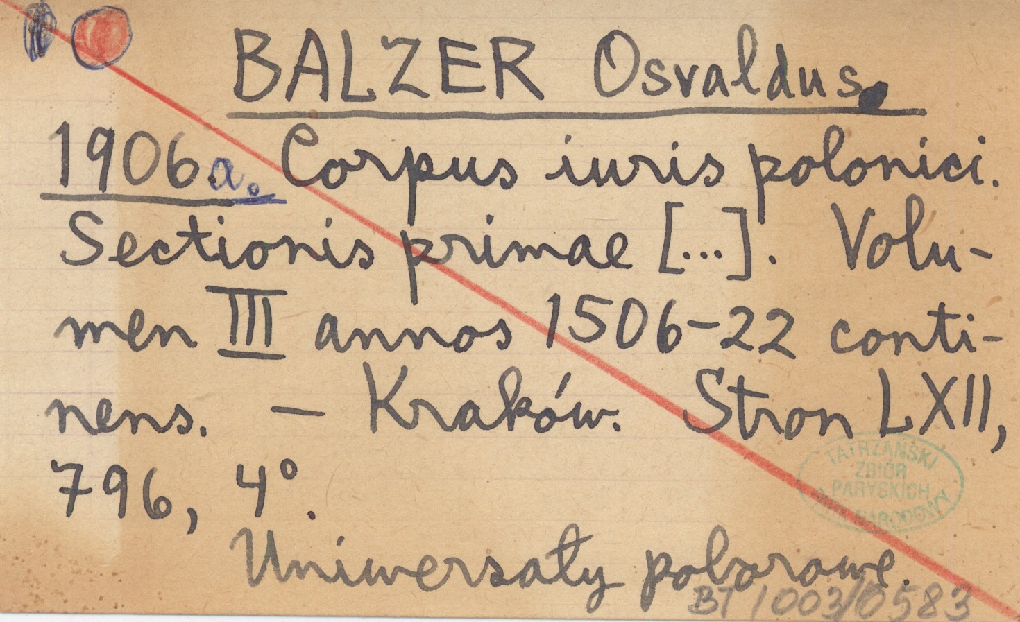 BALZER Osvaldus 1906 a Corpus iuris polonici. Sectionis primae [...]. Volumen III annos 1506-22 continens.