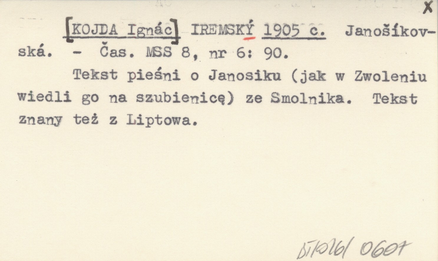 Čas. MSS, 8, nr 6: 90. Tekst pieśni o Janosiku (jak w Zwoleniu wiedli go na szubienicę) ze Smolnika. Tekst znany też z Liptowa.