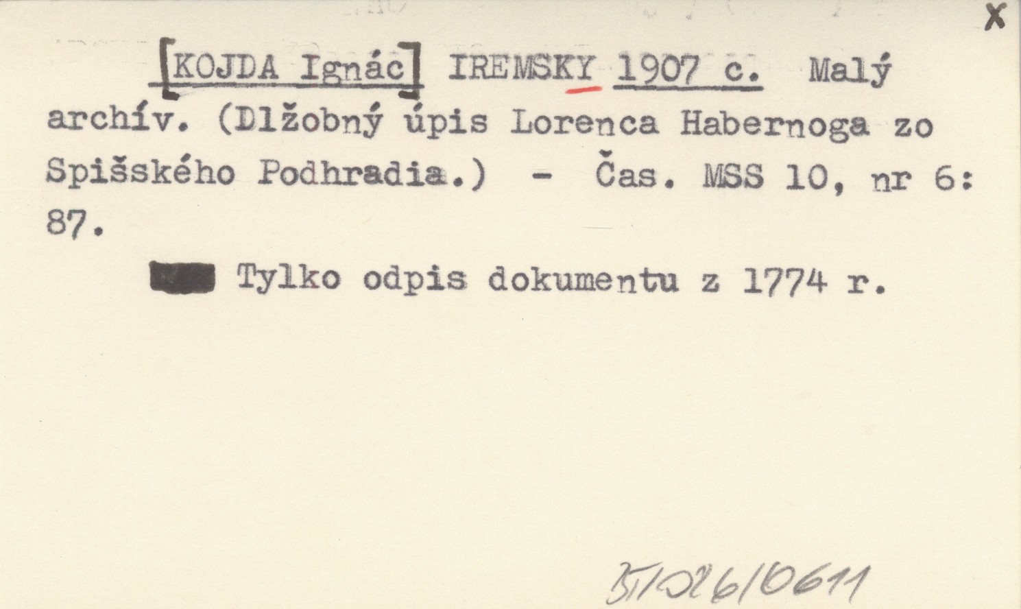 IREMSKY [KOJDA Ignác] 1907 c Malý archív. (Dlžobný úpis Lorenca Habernoga zo Spišského Podhradia.).