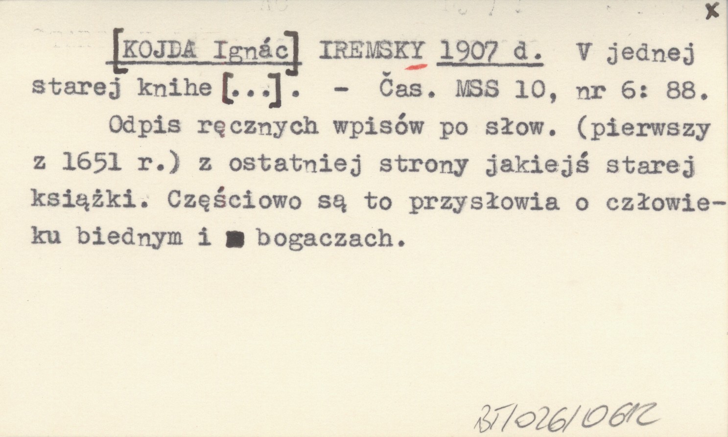 Čas. MSS, 10, nr 6: 88. Odpis ręcznych wpisów po słow. (pierwszy z 1651 r.) z ostatniej strony jakiejś starej książki. Częściowo są to przysłowia o człowieku biednym i bogaczach.