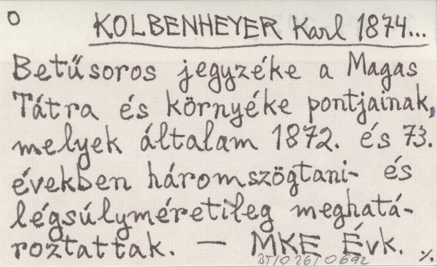 KOLBENHEYER Karl 1874... Betűsoros jegyzéke a Magas Tátra és környéke pontjainak, melyek általam 1872. és 73. években háromszögtani- és légsúlyméretileg meghatároztattak.