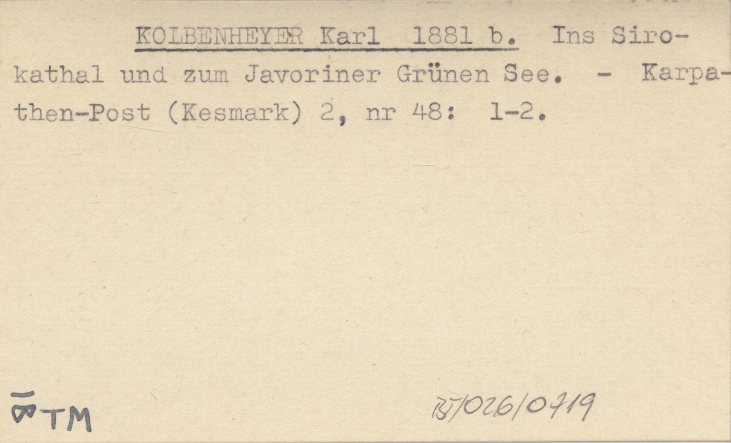 KOLBENHEYER Karl 1881 b Ins Sirokathal und zum Javoriner Grünen See.