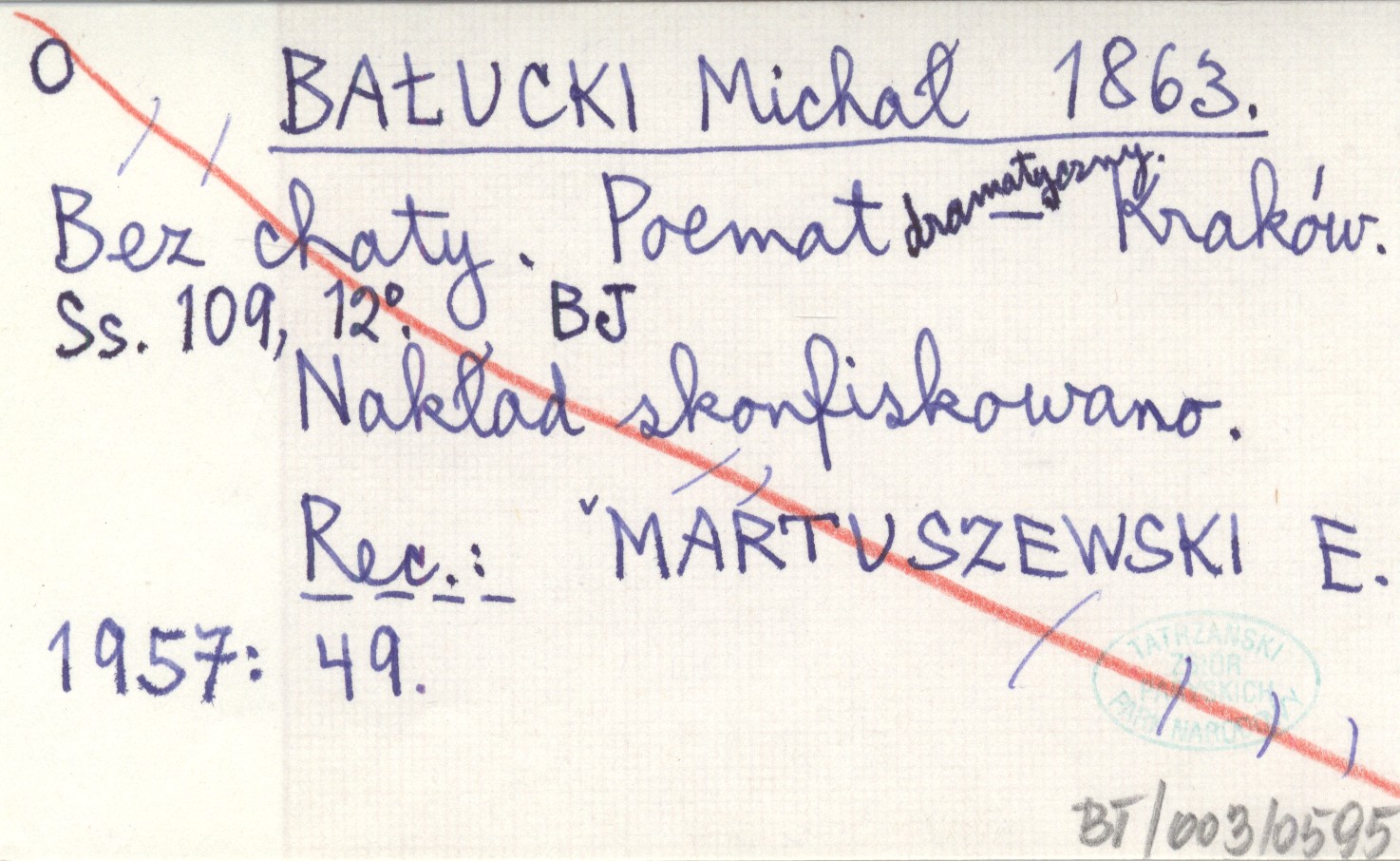 Kraków , 109 s., 12°. Nakład skonfiskowano. REC: MARTUSZEWSKI E. 1957: 49.
