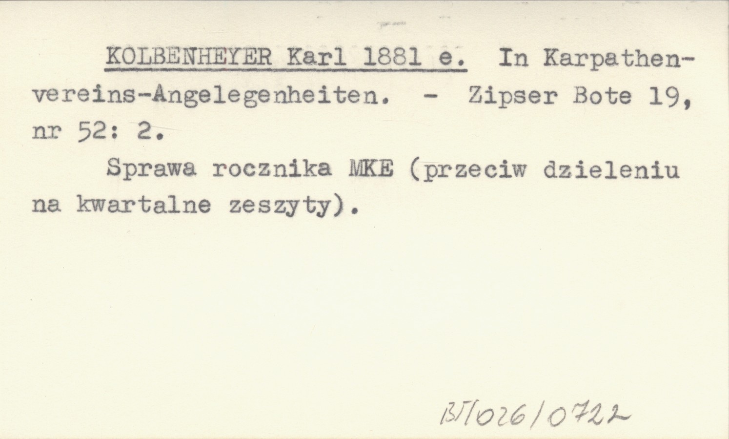 KOLBENHEYER Karl 1881 e In Karpathenvereins-Angelegenheiten.
