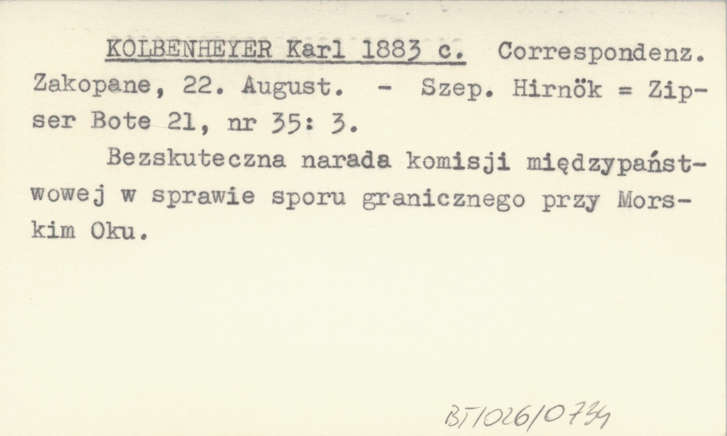 KOLBENHEYER Karl 1883 c Correspondenz. Zakopane, 22. August.