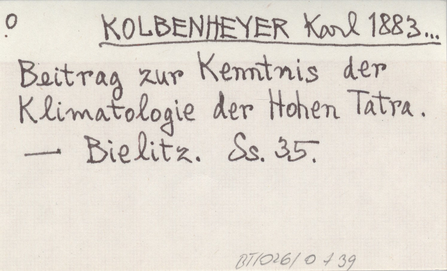 KOLBENHEYER Karl 1883... Beitrag zur Kenntnis der Klimatologie der Hohen Tatra.