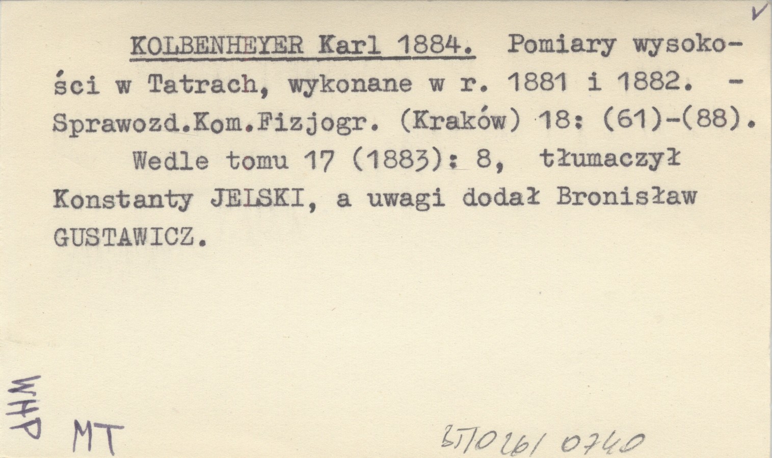 KOLBENHEYER Karl 1884 Pomiary wysokości w Tatrach, wykonane w r. 1881 i 1882.
