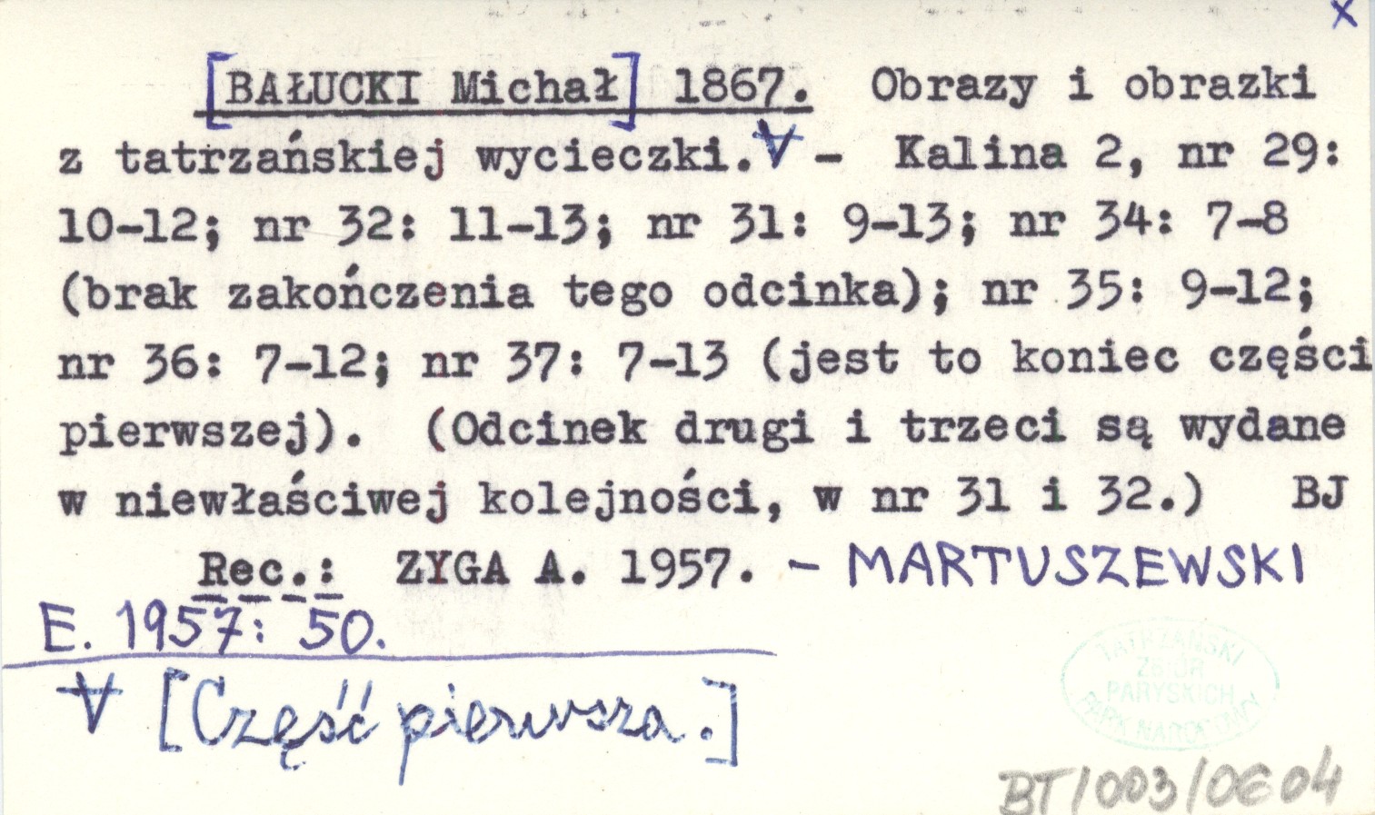 Kalina, 2, nr 29: 10-12 ; nr 32: 11-13 ; nr 31: 9-13 ; nr 34: 7-8 (brak zakończenia tego odcinka) ; nr 35: 9-12 ; nr 36: 7-12 ; nr 37: 7-13 (jest to koniec części pierwszej). Odcinek drugi i trzeci są wydane w niewłaściwej kolejności, w nr 31 i 32). REC: ZYGA A. 1957 ; MARTUSZEWSKI E. 1957: 50 ;