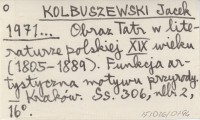 KOLBUSZEWSKI Jacek 1971... Obraz Tatr w literaturze polskiej XIX wieku (1805-1889). Funkcja artystyczna motywu przyrody.
