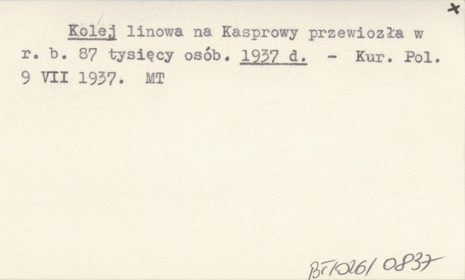 Kolej linowa na Kasprowy przewiozła w r. b. 87 tysięcy osób. 1937 d