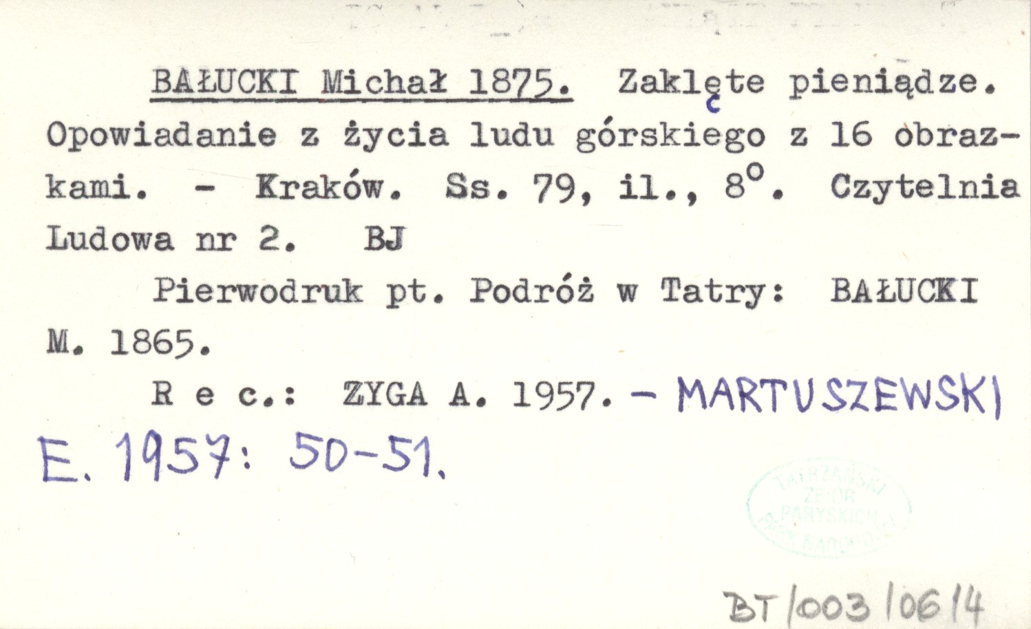 Czytelnia Ludowa (Kraków) , Nr 2: 79, il., 8°. Pierwodruk pt. Podróż w Tatry.: BAŁUCKI M. 1865. REC: ZYGA A. 1957 ; MARTUSZEWSKI E. 1957: 50-51 ;