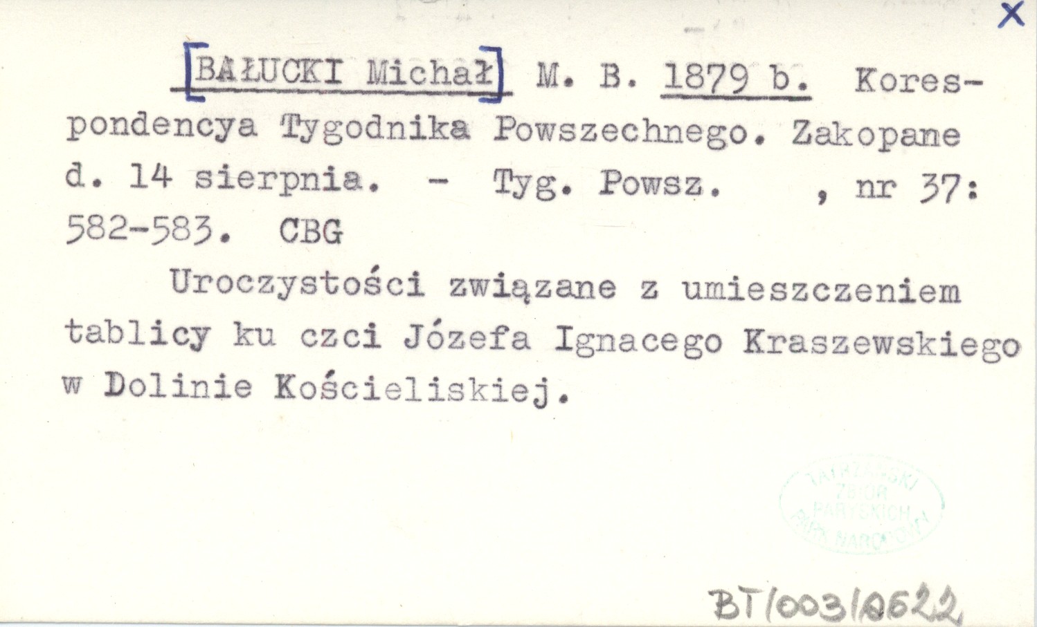 M. B. [BAŁUCKI Michał] 1879 b Korespondencya Tygodnika Powszechnego. Zakopane d. 14 sierpnia.