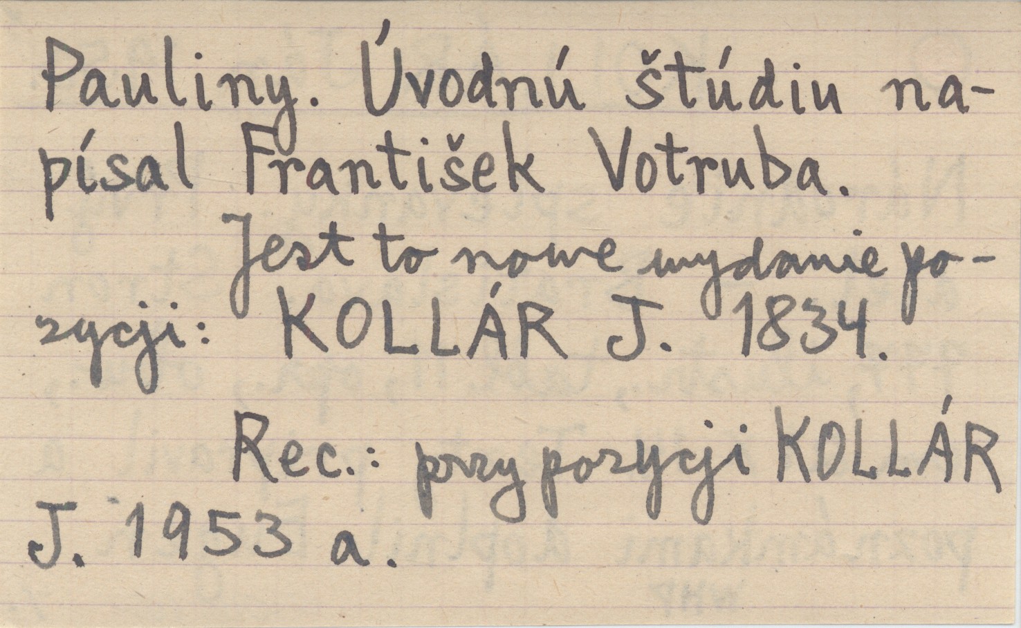 Bratislava , 777 s., il., 11 k. tabl., opr., obw., 21x14 cm. Texty pripravil a poznámkami doplnil Eugen Pauliny. Úvodnú ¹túdiu napísal Franti¹ek Votruba. Jest to nowe wydani pozycji: KOLLÁR J. 1834 REC: przy pozycji KOLLÁR J. 1953 a
