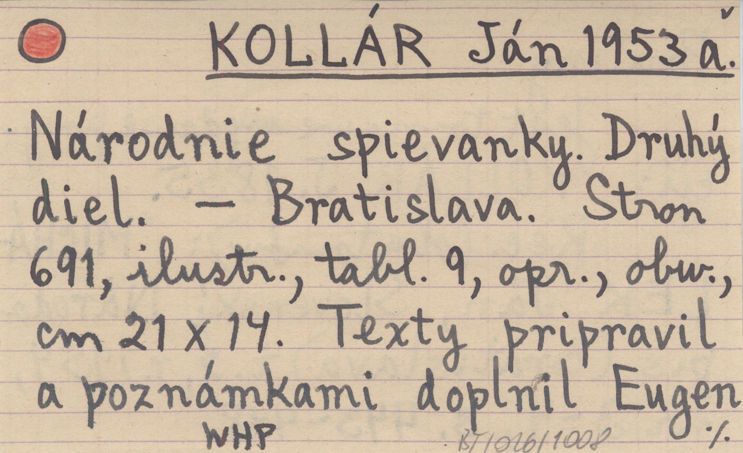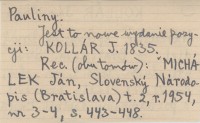 Bratislava , 691 s., il., 9 k. tabl., opr., obw., 21x14 cm. Texty pripravil a poznámkami doplnil Eugen Pauliny. Jest to nowe wydanie pozycji: KOLLÁR J. 1835 REC: (obu tomów) MICHÁLEK Ján, Slovenský Národopis (Bratislava) t. 2, r. 1954, nr 3-4: 443-448