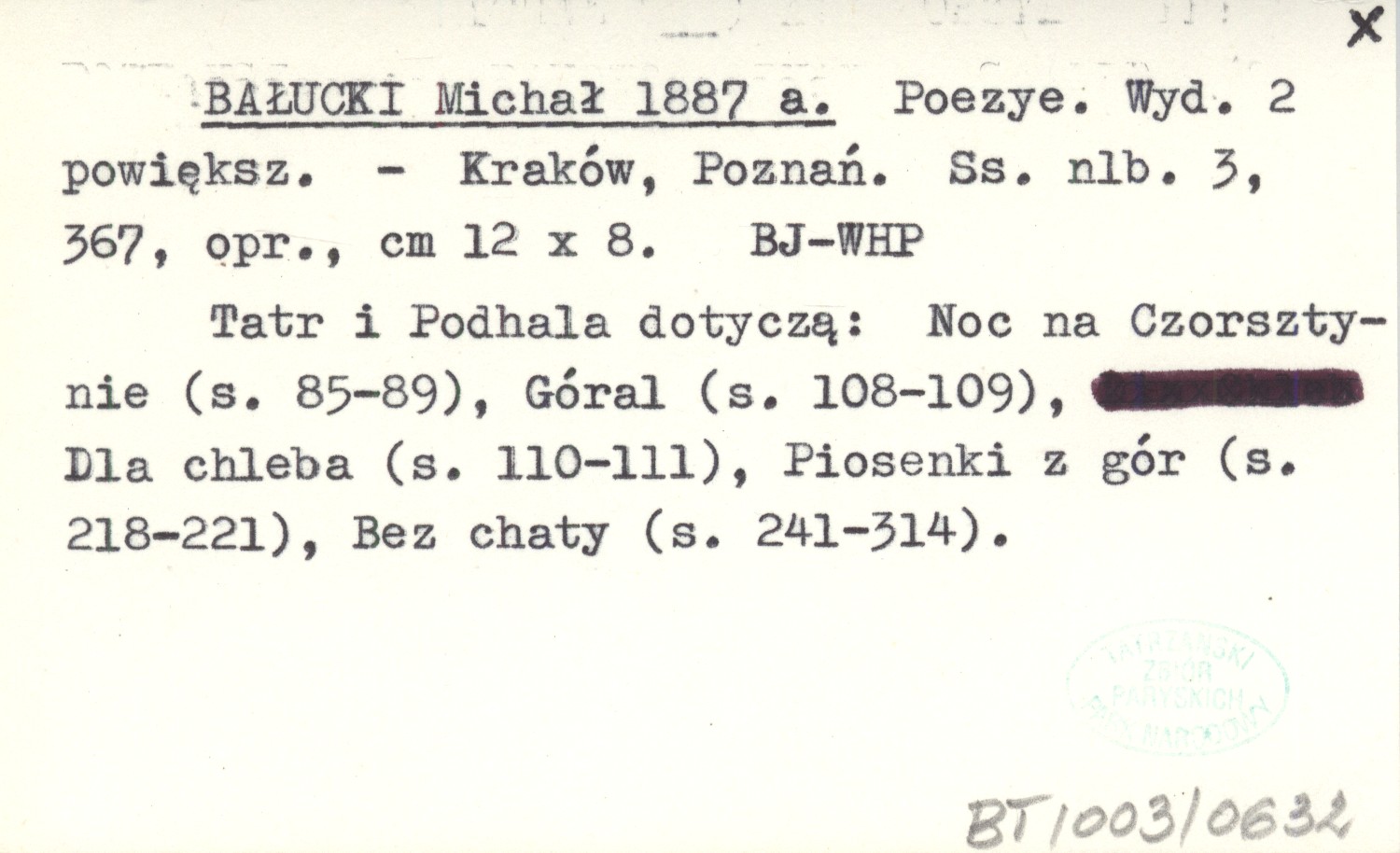 WYD: 2 uzup. Kraków ; Poznań , [3], 367 s., opr., 12x8 cm. Tatr i Podhala dotyczą: Noc na Czorsztynie (s. 85-89), Góral (s. 108-109), Dla chleba (s. 110-111), Piosenki z gór (s. 218-221), Bez chaty (s. 241-314).