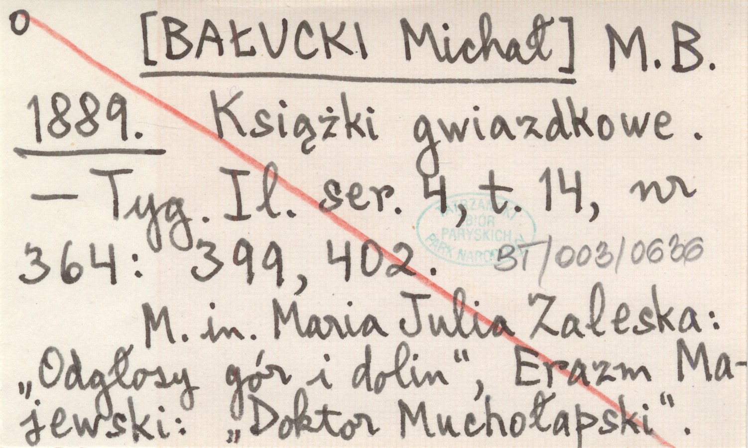 Tygodnik Ilustrowany, Ser. 4, t. 14, nr 364: 399, 402. M. in. Maria Julia Zaleska: "Odgłosy gór i dolin", Erazm Majewski: "Doktor Muchołapski".
