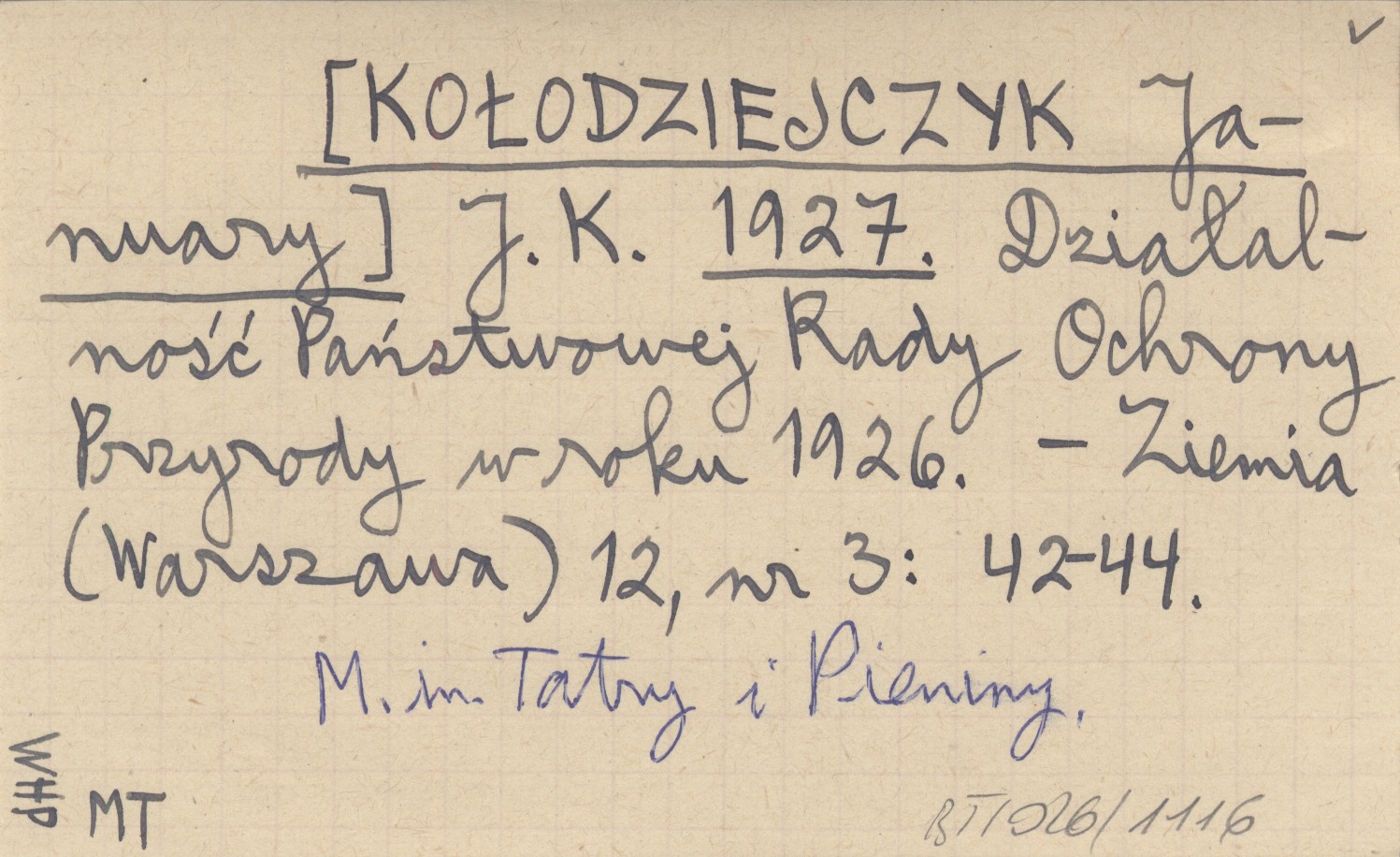 J. K. [KOŁODZIEJCZYK January] 1927 Działalność Państwowej Rady Ochrony Przyrody w roku 1926.