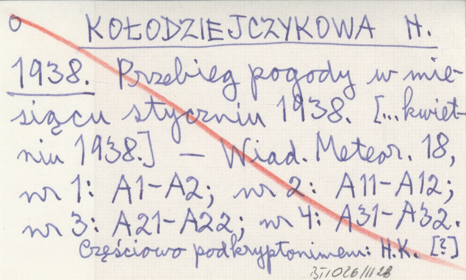 Wiadomości Meteorologiczne, 18, nr 1: A1-A2; nr 2: A11-A12; nr 3: A21-A22; nr 4: A31-A32. Częściowo pod kryptonimem: H. K. [?]