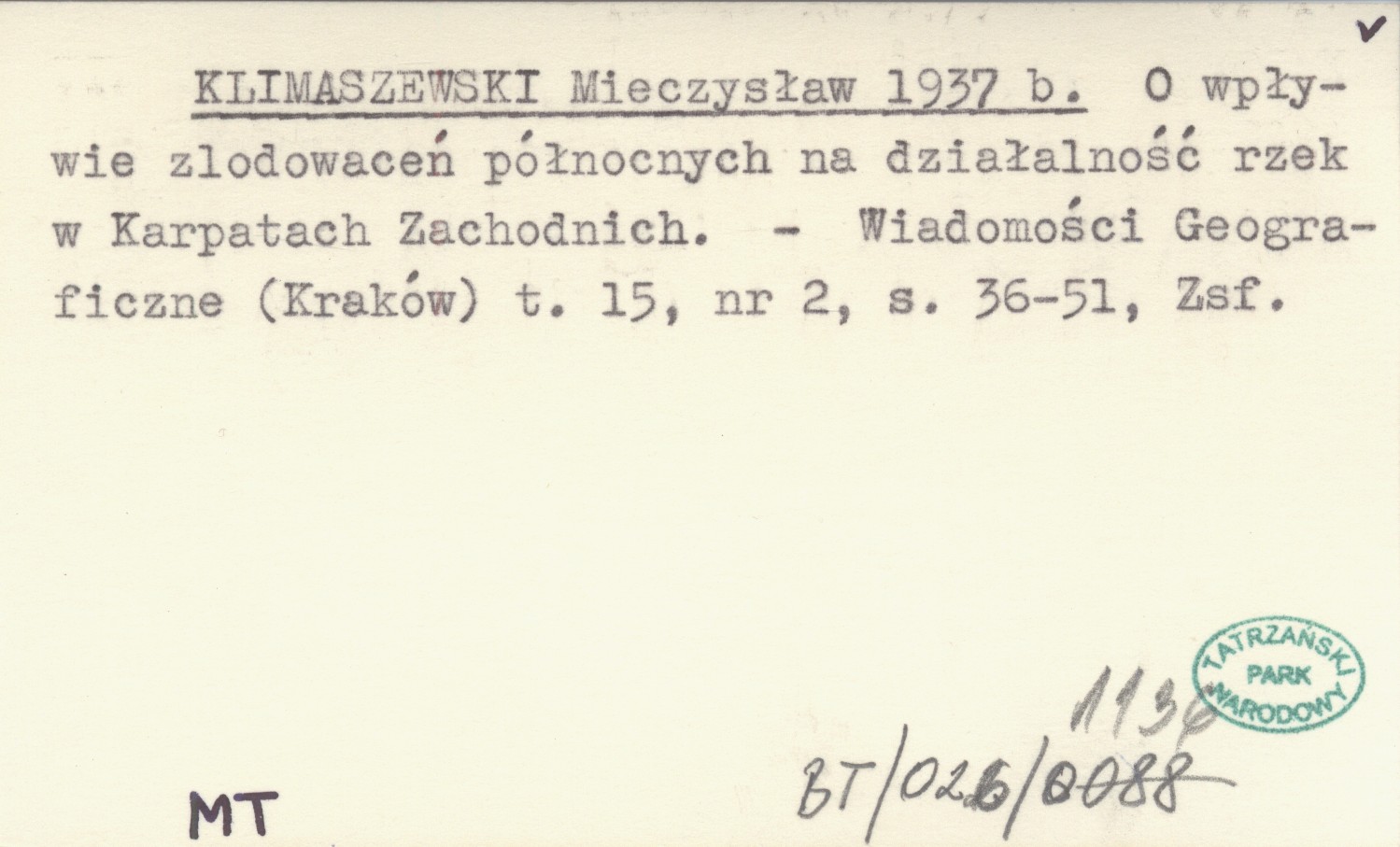 KLIMASZEWSKI Mieczysław 1937 b O wpływie zlodowaceń północnych na działalność rzek w Karpatach Zachodnich.