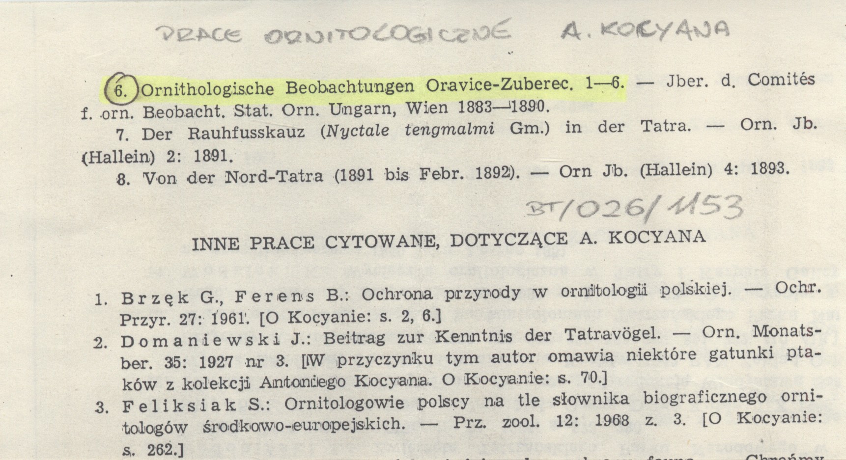 KOCYAN A. 1883-1890 Ornithologische Beobachtungen Oravice-Zuberec.