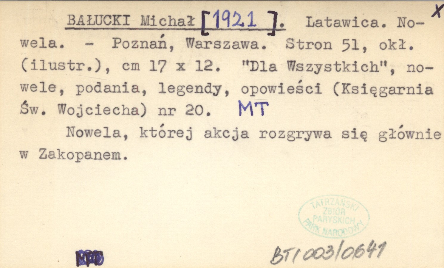 "Dla Wszystkich", nowele, podania, legendy, opowieści. Nr 20. Księgarnia Św. Wojciecha, Poznań ; Warszawa ; , 51 s., okł. (il.), 17x12 cm. Nowela, której akcja rozgrywa się głównie w Zakopanem.
