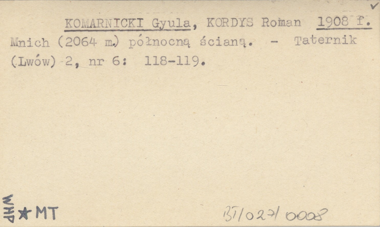 KOMARNICKI Gyula KORDYS, Roman. ; 1908 f Mnich (2064 m.) północną ścianą.