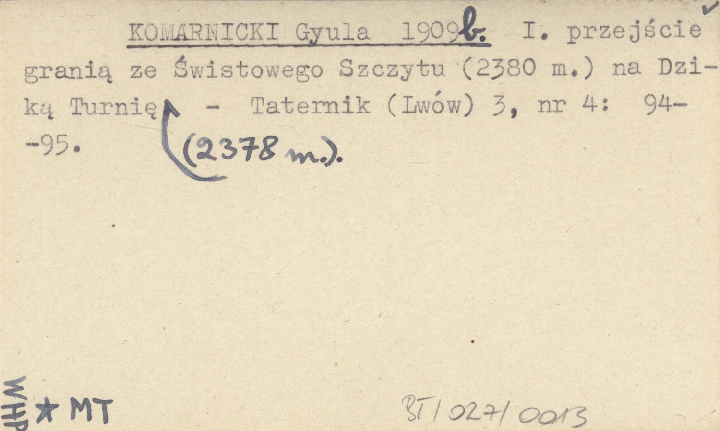 KOMARNICKI Gyula 1909 b I. przejście granią ze Świstowego Szczytu (2380 m.) na Dziką Turnię (2378 m.).