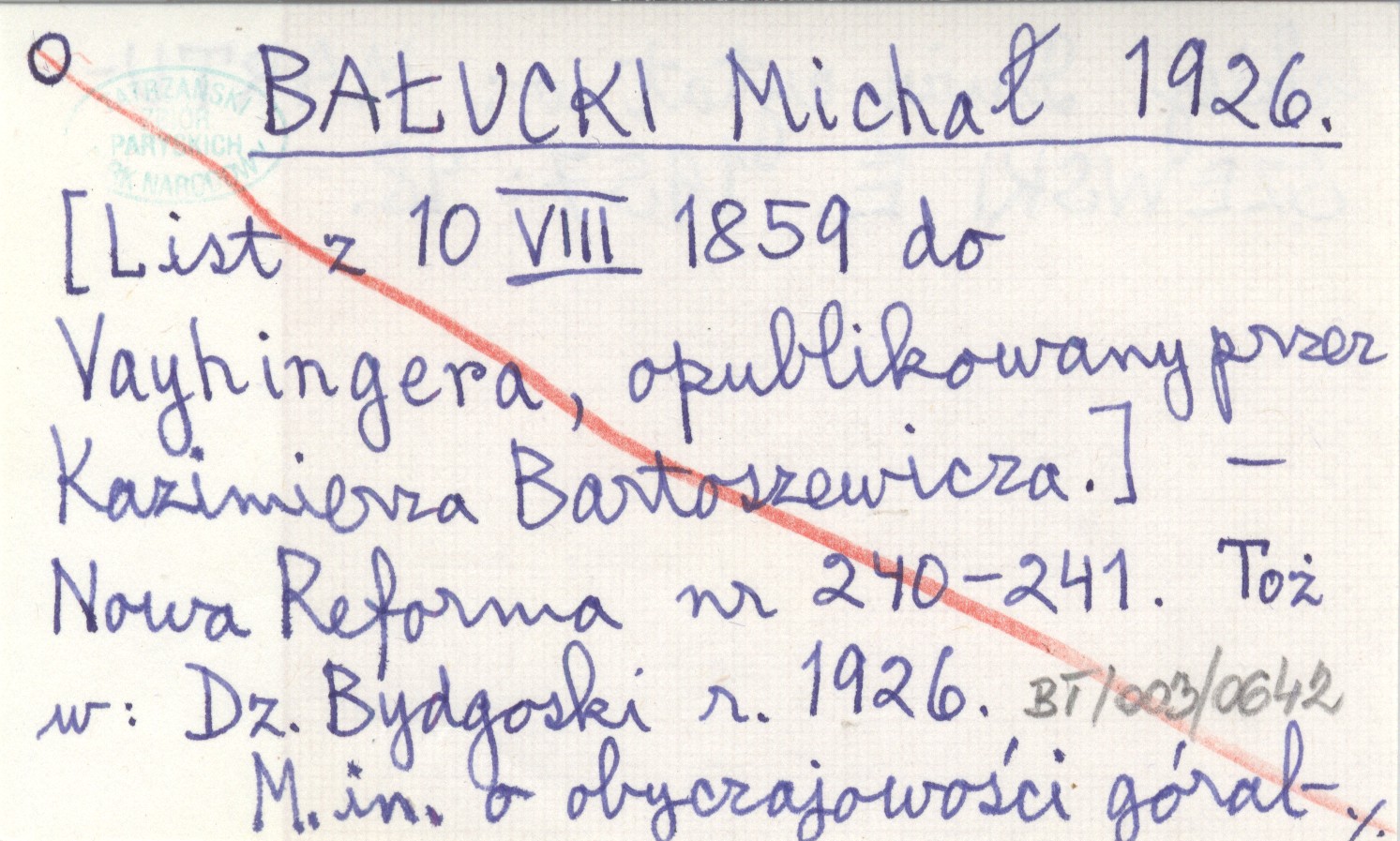 BAŁUCKI Michał 1926 [List z 10 VIII 1859 do Vayhingera, opublikowany przez Kazimierza Bartoszewicza.]