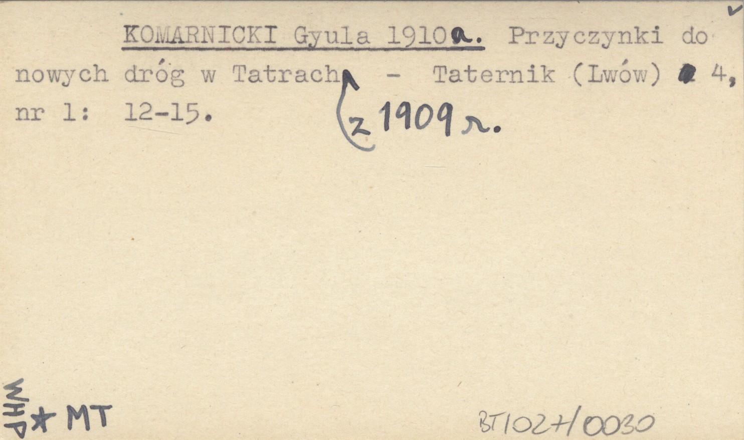KOMARNICKI Gyula 1910 a Przyczynki do nowych dróg w Tatrach z 1909 r.
