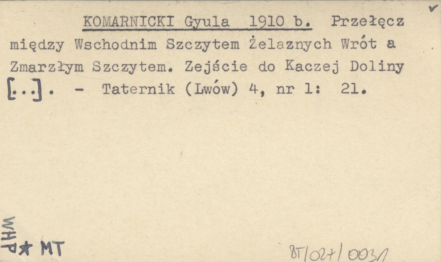 KOMARNICKI Gyula 1910 b Przełęcz między Wschodnim Szczytem Żelaznych Wrót a Zmarzłym Szczytem. Zejście do Kaczej Doliny [...].